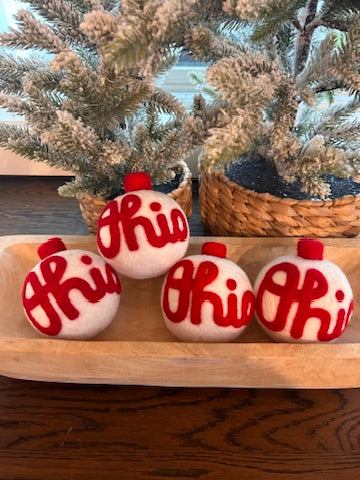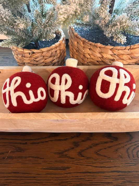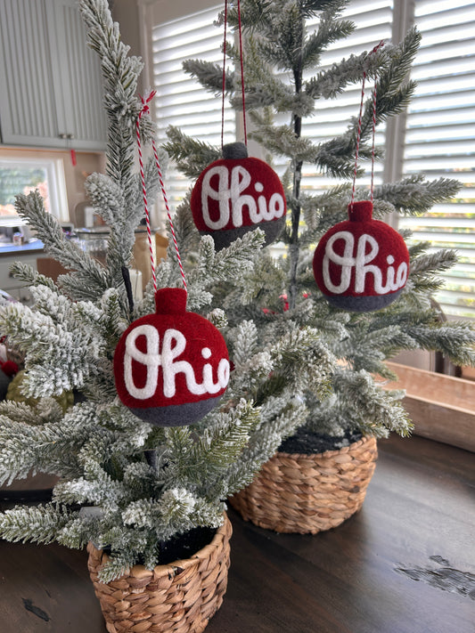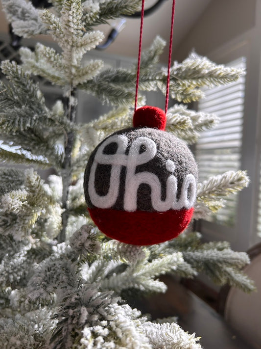 Script Ohio - Split grey and scarlet ornament with white script Ohio